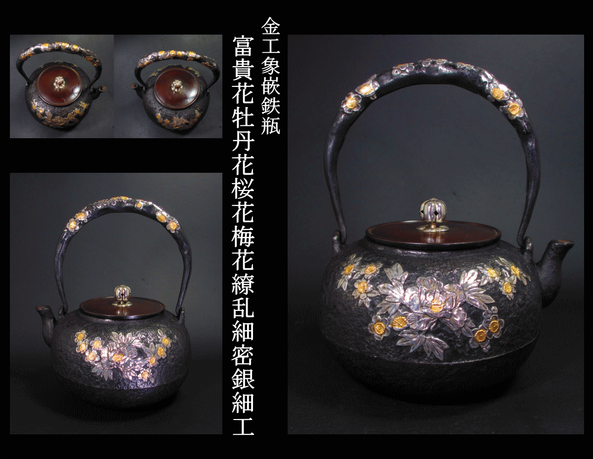 3. 金工の逸品!富貴花牡丹・桜・梅花鉄瓶、豪華細密銀細工・紅紫銅蓋付き