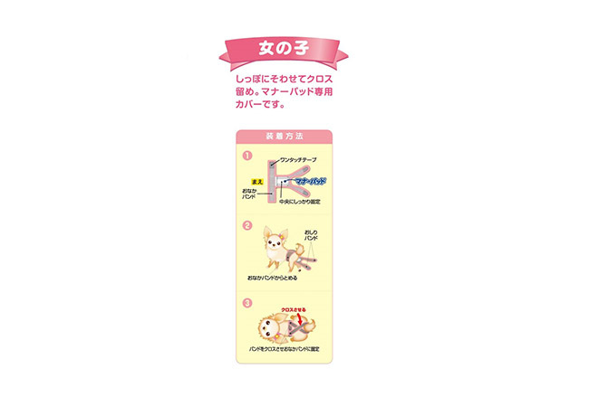 女の子の体型に合わせて開発した女の子専用アウターです。新開発「しっぽのクロスバンド」はしっぽで固定する新しい発想!ズレを解消し、サイズ調整と取りかえが簡単です。伸縮性ニット素材と、おしりを覆う面積を最大限に小さくすることで、愛犬のストレスを軽減、遊びの幅も広がります。専用のマナーパッドと併用すると衛生・経済的です。