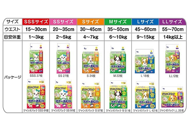 「おでかけ」「マーキング」「生理」「おもらし」「介護」など、パピーからシニアまでずっと安心して使える紙おむつです。