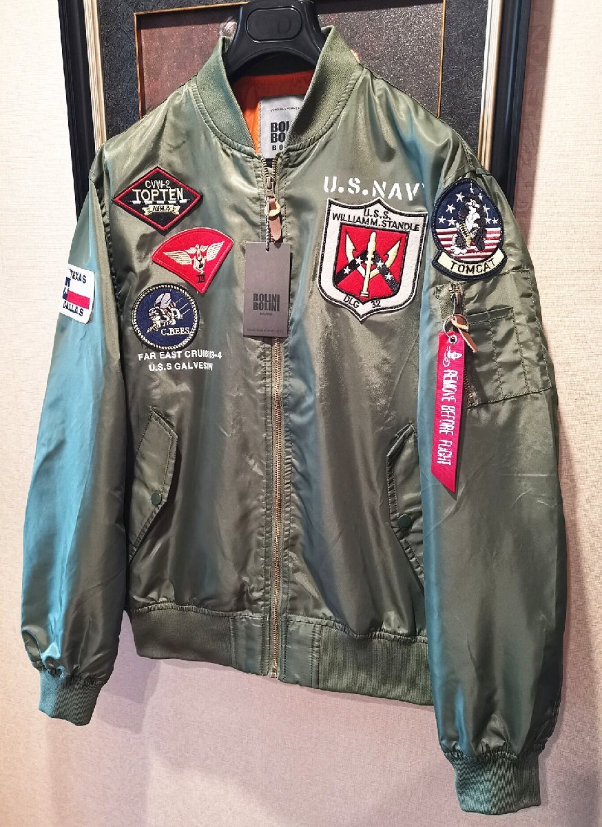 ROBERT CAVANI発※今シーズンTOPGUN/トップガン復刻・MA-1/フライトジャケット。生トムクルーズ主演の大ヒット映画『TOPGUN/トップガン』復刻のMA-1フライトジャケットです!MA-1の原型を踏襲し撥水防寒を備えた高機能ポリエステル生地を採用。多数のワッペンが特徴的な一着です。インナーなし薄手の仕様で今節に最適の一着です。