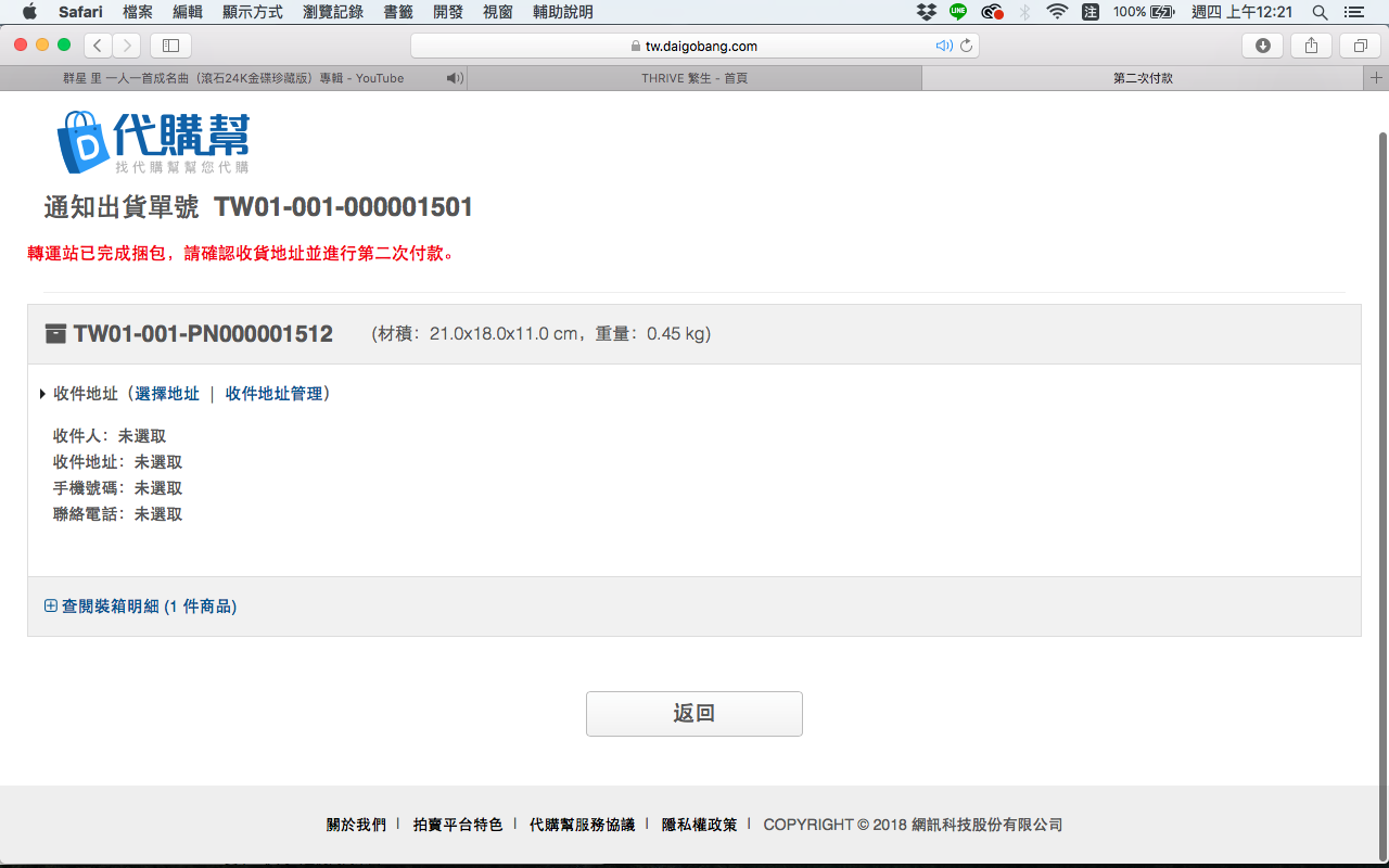之後就可以進行第二次付款,記得要去填資訊就可以選擇收件地址