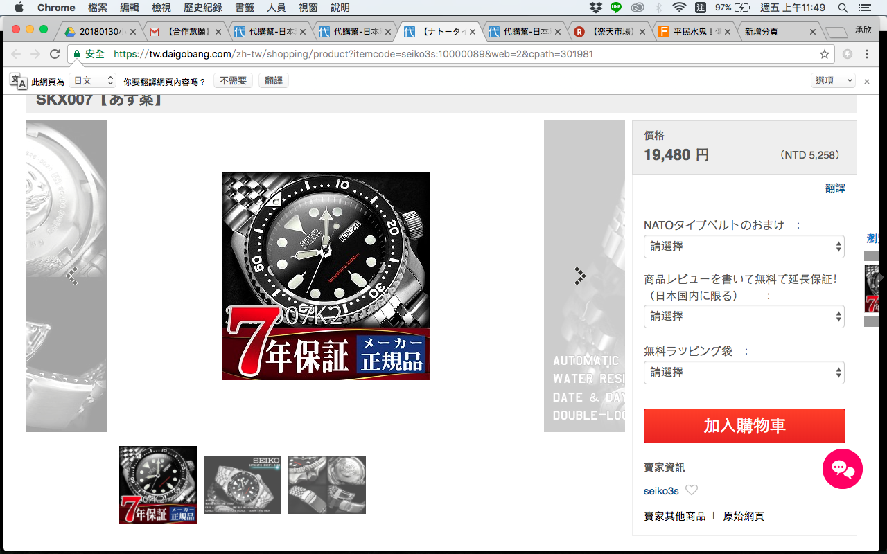 於是我就用代購幫上了日本的樂天去尋找便宜的Seiko SKX007,再加上007惡魔四伏裡的那隻早就燒我好久的搭配,配戴Nato錶帶的OMEGA。