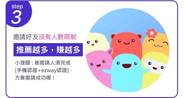 - 邀請人須已完成[手機認證+ezway認證],方能至[會員中心 > 我的邀請紀錄]取得推薦好友連結。