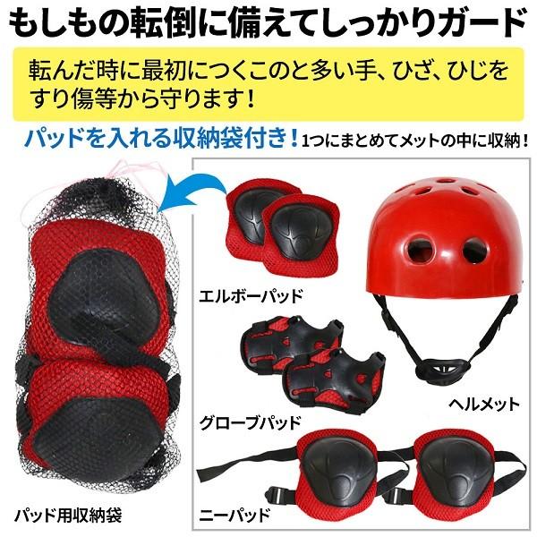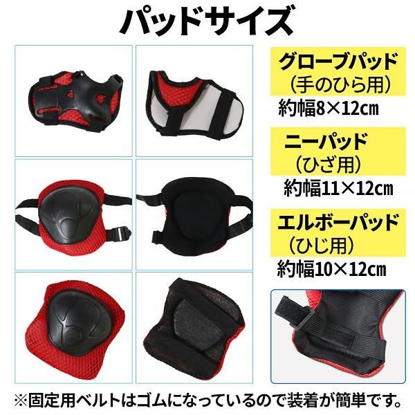 ヘルメット、グローブパッド(手のひら)、ニーパッド(膝当て)、エルボーパッド(肘当て)