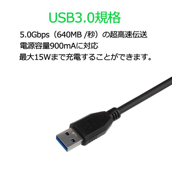 USB typeA端子からtypeC端子搭載の携帯電話・スマホ・タブレットを最大15Wまで充電することができます。 USB 3.0インターフェイスの電源容量900mAに対応。