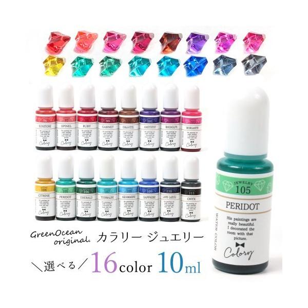 宝石のような深みのある輝きと水のように澄み切った透明感♪発色の良い着色剤カラリーのジュエリーカラー。豊富な16色から選べるよ!少量でしっかりと発色し、透明で硬化しやすいからレジン初心者さんにもオススメ。