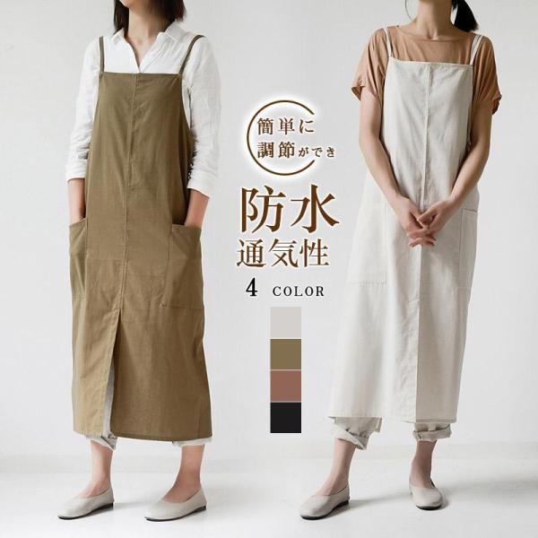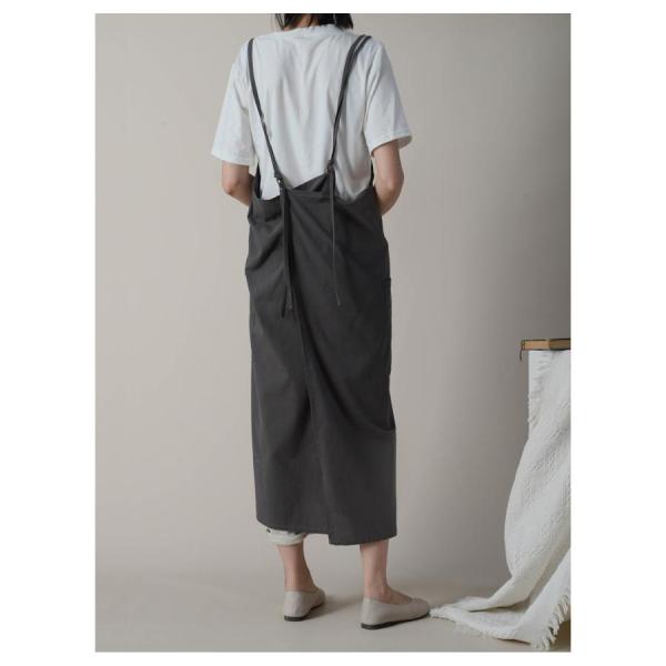 【簡単着脱&調節可能】肩紐の長さも調整できるので、自分好みの着丈やシルエットに調整可能。二本のひもを一緒に後ろでクロスするように左右の穴に通していただき肩紐を調整していただくとモデルのように、後ろの部分が重なります。ボタン無し、腰ひも無しかぶるだけで簡単着脱。