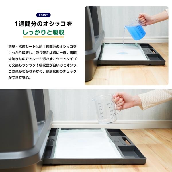 ◇◇ 【サイズ】約700mm×470mm×350mm 【特長】 ●大型の猫ちゃんや肥満気味の猫ちゃんでも快適に排泄ができる、猫用システムトイレ。 【仕様】 ●お手入れカンタン、閉めきったお部屋でもニオわない、猫用のシステムトイレです。 ●広々快適な排泄スペースで、大型の愛猫でも無理のない姿勢で排泄ができます。 ●サンド飛び散り防止構造を採用し、高めの壁で砂の飛び散りをブロックします。 ●サイズ(約):700mm×470mm×350mm ●重量・質量:8.4kg ●成分:本体/ポリプロピレン、サンド/ゼオライト・シリカゲル、シート/ポリオレフィン不織布・綿上パルプ・吸水紙・高分子吸水材・ポリエチレンフィルム・抗菌剤・ホットメルト接着剤・香料入り消臭マイクロカプセル ●生産国:日本 ●原産国:日本 【使用上のご注意】 ※用途以外には使用しないでください ※トイレは汚れてもかまわない場所、平らな場所に置いて使用してください。 ※トイレは暖房器具の近くに置いたり、熱湯をかけたりしないでください。人やペットのやけど、火災、製品が変形する恐れがあります。