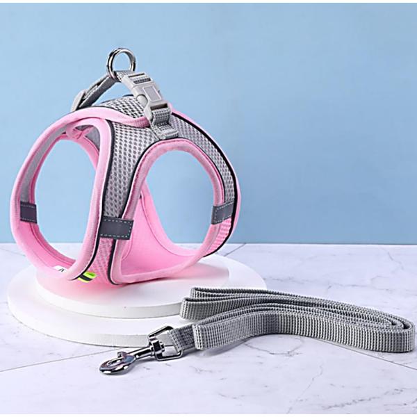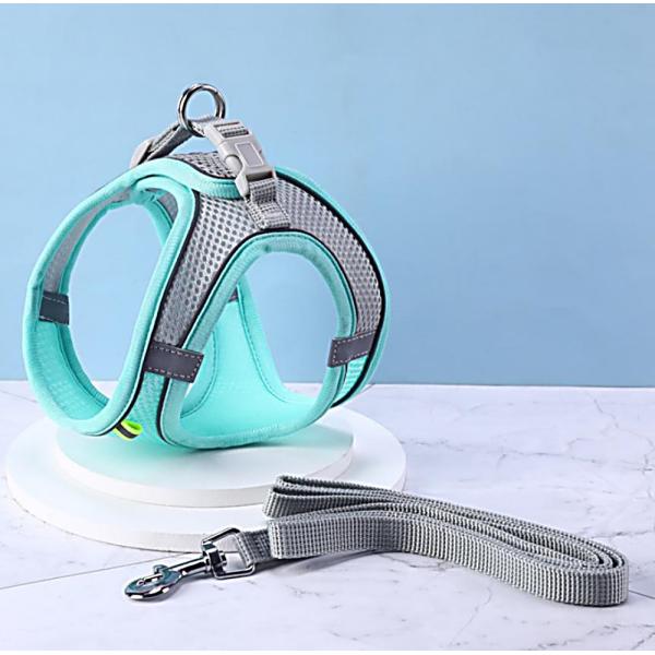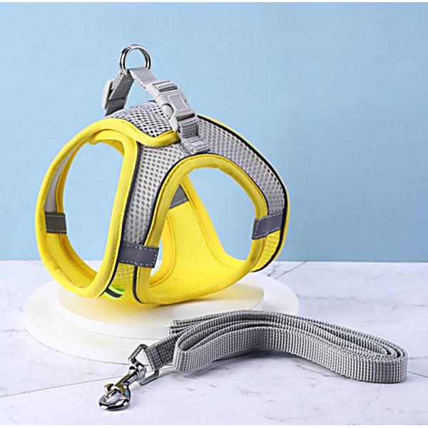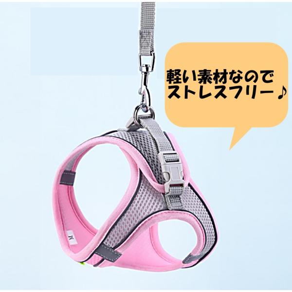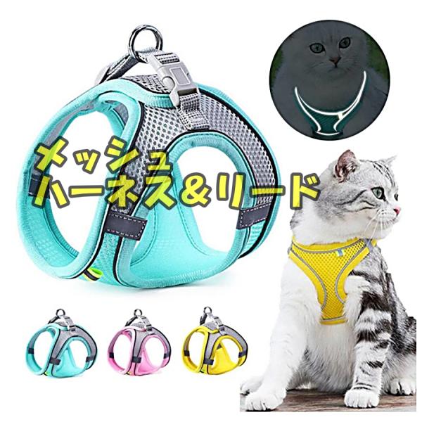 ハーネス&リードセット。メッシュ素材で通気性抜群です。蒸れないのでオールシーズン使用可能です。胴回りに取り付けるので、ワンちゃん猫ちゃんの首に負担が掛かりません。ハーネスタイプなので散歩中の急な動きにも 抜けることなく安心です。軽量なやわらかい素材なのでワンちゃん猫ちゃんへの負担が少ないです。反射素材付きなので夜の散歩にも安心です。マジックテープとバックルで簡単に装着できます。ベルト部分はアジャスタ付きで調整が可能です。