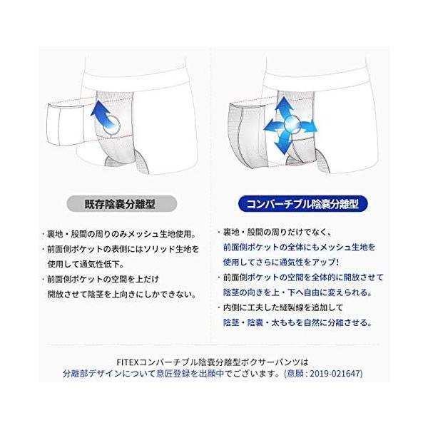 メイン素材: ポリエステル92%, ポリウレタン8%|<自然に分離収納> 自然に陰茎・陰嚢・太ももが分離できるよう、立体パターン&内側に工夫した縫製線を入れることで、肌への摩擦や男性の悩みである蒸れやベタツキを抑えられてより快適で履き心地が抜群です。|<優秀な通気性&吸汗速乾性> 汗が溜まりやすくて蒸れやすい中心部と股間へ直接触れる裏地と前面側ポケット全体にメッシュ生地使用&吸汗速乾性に優れMAXCOOL機能性生地を使用してより通気性をアップさせ、常に男性に理想的な温度と快適な状態が保たれます。|<便利な分離収納ポケット> 前面側ポケットの空間をすべて開放させて陰茎の向きを一方向に決めずに上・下へ自由に置くことができます。また、ポケット上部に穴が開いていて熱を排出しやすく、下着を脱がずに簡単に用を済せるので、とても便利で快適です。|<優れた履き心地> どの方向にも良く伸びる優れた伸縮性素材で、身体の動きに合わせてフィットするので、非常に動きやすいです。また、後面は継ぎ目がないシームレス製作されて肌への摩擦が少なく、刺激や不快感を減らして肌触りがソフトで優しいです。|<サイズ> S(USサイズ)-日本サイズM相当 / M(USサイズ)-日本サイズL相当 / L(USサイズ)-日本サイズ2L相当 / XL(USサイズ)-日本サイズ3L相当 / XXL(USサイズ)-日本サイズ4L相当 * ご注文の前に必ずサイズのご確認をお願い致します。<商標> FITEXは日本とアメリカにて公式に商標権登録された商標でございます。(商標登録第5964298号)||FITEXはアンダーウェア全般にかけて高機能性素材を基に優れた伸縮性・機能性・デザインを備えたアンダーウェア専門ブランドです。|日常生活のみならず、スポーツ・旅行・レザーなどいつどこでも優れた活動性を追求する方々のために様々な商品が備えています。|FITEXは日本とアメリカにて公式に商標権登録された商標でございます。(商標登録第5964298号)|POINT 1. コンバーチブル収納|陰茎の向きを一方向に決めずに上向き・下向きへ自由に変更できるので、履き心地が快適です。|POINT 2. 優れた通気性|通気性を高めるためにメッシュ素材採用し、ベタツキや蒸れを抑えてより快適で履き心地が良いです。|POINT 3. パワーストレッチ|どんな動きにもフィットできるように、全方向にパワーストレッチできる伸縮性を持っているため、活動性や運動性が抜群です。|POINT 4. 優秀な吸汗速乾性|汗を素早く吸収・乾燥させてさらりとした肌触りをキープできる吸汗速乾性に優れた機能性素材を使用しました。|スタイル|ブリーフ|ブリーフ|ロング・ローライズ|ロング・ローライズ|ロング・ローライズ|スリムフィット|(商品名:FITEX 陰嚢分離 パンツ メンズ 下着 陰嚢分離型 ボクサーパンツ 上向き 下向き 通気 メッシュ ストレッチ 蒸れない セット 3枚組)