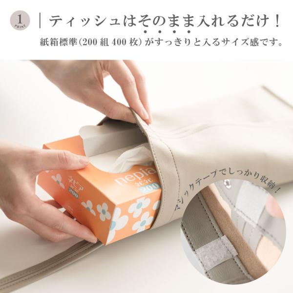 【広めのティッシュ引き出し口/簡単に入れ替え可能】紙箱やソフトパックのティッシュを入れるだけ。取り替え口はマジックテープで閉じられ、交換も簡単。紙箱ボックスティッシュケース(2枚重ね200セット)をすっきり収納できます。ティッシュは広めの引き出し口からサッと出せて使いやすい。掛けておけば、小さなお子さまやペットのいたずら防止にもなります。