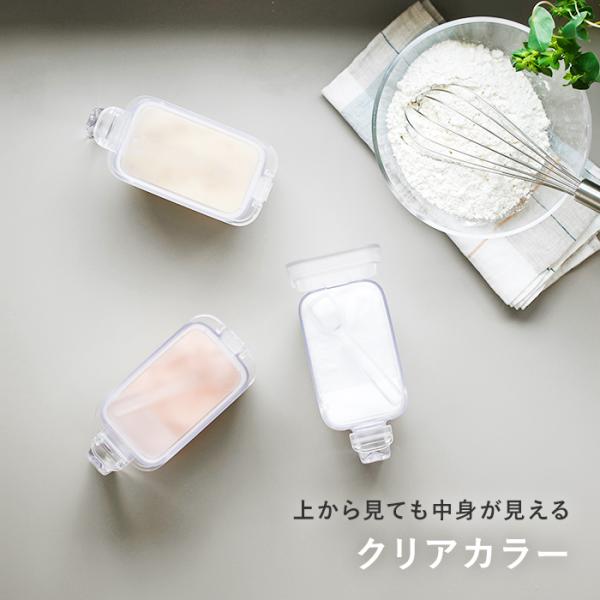 パッキン付きで湿気を防いでくれるから、調味料が固まりにくいのも◎。5ml計れる小さじスプーンとすりきり板も付いていて、サッと計量できるから料理もはかどります。