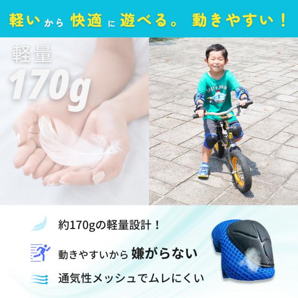 Eマーク取得の高品質子供用プロテクター。EVAスポンジで衝撃吸収、軽量柔軟で動きやすい。成長に合わせサイズ調整可。メッシュでムレにくく、長時間快適。自転車やスケボー等で安全に楽しく遊べます。